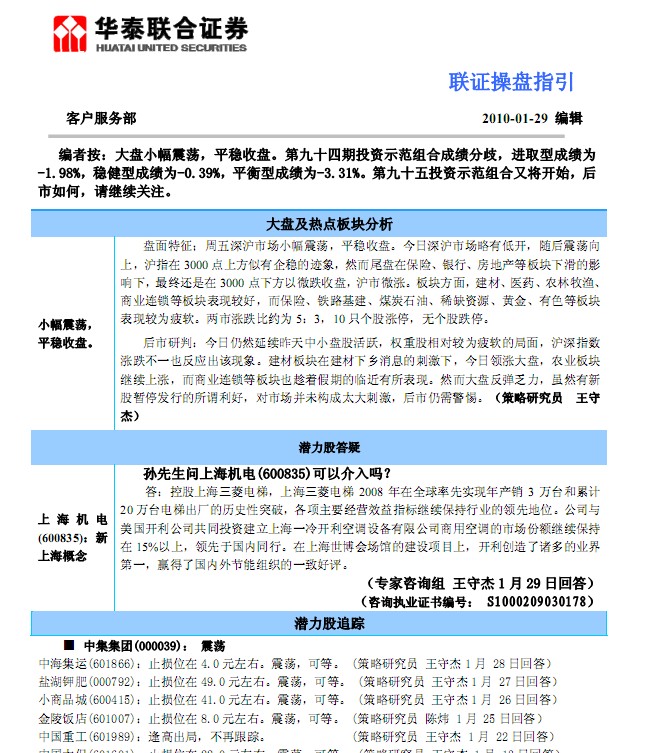 盘面特征;周五深沪市场小幅震荡,平稳收盘。今日深沪市场略有低开,随后震荡向上,沪指在 3000 点上方似有企稳的迹象,然而尾盘在保险、银行、房地产等板块下滑的影响下,最终还是在 3000 点下方以微跌收盘,沪市微涨。板块方面,建材、医药、农林牧渔、商业连锁等板块表现较好,而保险、铁路基建、煤炭石油、稀缺资源、黄金、有色等板块表现较为疲软。两市涨跌比约为 5:3,10 只个股涨停,无个股跌停。 后市研判:今日仍然延续昨天中小盘股活跃,权重股相对较为疲软的局面,沪深指数涨跌不一也反应出该现象。建材板块在建材下乡消息的刺激下,今日领涨大盘,农业板块继续上涨,而商业连锁等板块也趁着假期的临近有所表现。然而大盘反弹乏力,虽然有新股暂停发行的所谓利好,对市场并未构成太大刺激,后市仍需警惕.......