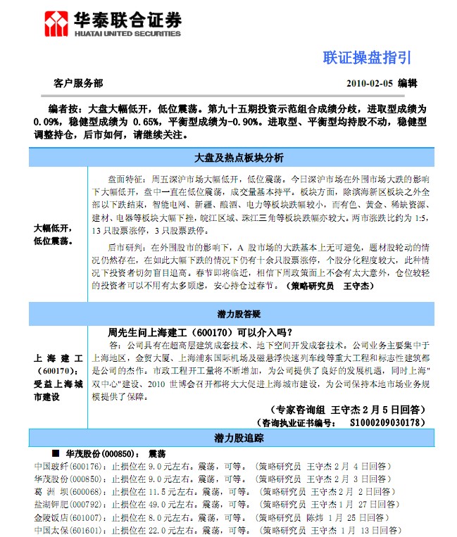 2月5日联合证券操盘指引