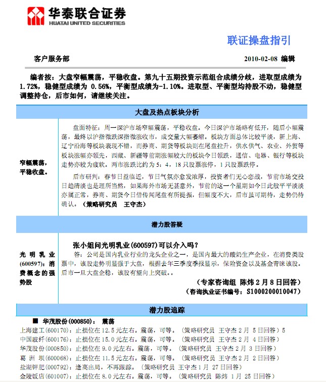 盘面特征:周一深沪市场窄幅震荡,平稳收盘。今日深沪市场略有低开,随后小幅震荡,最终以沪指微跌深指微涨收市,成交量大幅萎缩。板块方面总体比较平淡,新上海、辽宁沿海等板块表现不错,而券商、期货等板块则在尾盘拉升,供水供气、农业、外贸等板块涨幅亦领先,西藏、新疆等前期涨幅较大的板块今日领跌,通信、电器、银行等板块走势亦较为疲软。两市涨跌比约为 5:4,18 只股票涨停,1 只股票跌停。 后市研判:春节日益临近,节日气氛亦愈发浓厚,投资者们无心恋战,节前市场交投日趋清淡也是理所当然,如果海外市场无甚意外,节前的这一个星期如今日此般平平淡淡亦属正常,券商、期货今日借传闻尾盘有所提振,但幅度不大,后市虽可期待,走势仍待......