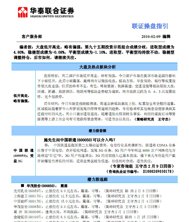 盘面特征:周二深沪市场低开高走,略有偏强。今日深沪市场在美国市场走弱的影响下小幅低开,此后小幅震荡,最终两市以微涨收盘。板块方面,早盘保险、银行等权重股带领大盘走强,但后劲略有不足,有色、稀缺资源、铁路基建、交通设施等板块领涨大盘,西藏、新疆、旅游酒店、物联网等板块走势较为疲软。两市涨跌比约为 5:4,3 只股票涨停,无个股跌停。 后市研判:今日市场交投继续清淡,高速公路板块表现上佳,权重股也有企稳的迹象。区域板块随着罗牛山和罗顿发展的停牌有退潮的趋势,年前恐难有其他概念股能够承继其近段时间的风光。周小川表示通胀显现,随着通胀由预期转为事实,相应的煤炭石油等资源类等上游上市公司有可能获得资金青睐,可适当加以关注.......
