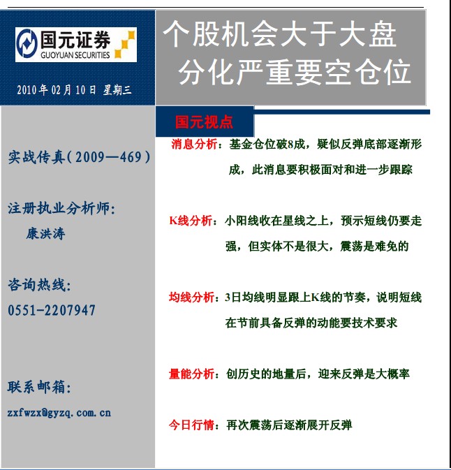酝酿反弹仍要进行 纵观盘中上午加速,尾盘反复的局面中,我们发现空方杀跌动力在大幅减弱,但同时也显示出市场买盘的人气还是极度不足,盘中难以组织起有力度的持续上攻,各板块都处于观望状态跟随股指波动,而不仅是国内市场如此,在国际的市场中在整体对于股指的后市反弹充满了疑虑,光靠市场内在的一些力量难以支撑股指大幅回升,而继续进行弱势反弹的结果很可能在消耗掉反弹动力后还要进行下探寻找支撑。因此,目前市场必须尽快出现放量拉升,打破现在极度低迷的弱势格局,才有机会出现转机。 技术上,上证指数连续两天收出星线,而昨日也是小阳线小幅度上来的态势,说明当前市场还是处于一个相对平衡的状态,目前主要是大盘蓝筹股的弱势压制了反弹力度,同时中小盘股活跃度的逐渐降低也使得市场人气受到明显影响,对此,我们分析认为短线股指还未摆脱弱势格局,但整体的跌幅已经从短线看是可以,故........