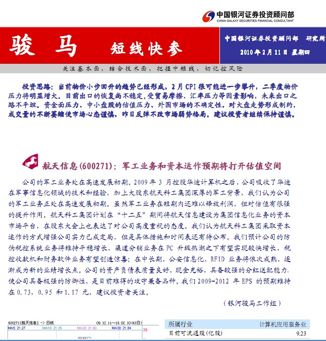 航天信息(600271) :军工业务和资本运作预期将打开估值空间 公司的军工业务处在高速发展初期。 2009 年 3 月控股华迪计算机之后,公司吸收了华 迪在军事信息化领域的技术和经验,加上大股东航天科工集团深厚的军工背景,我们认为公司的军工业务正处在高速发展初期。虽然军工业务在短期内还难以释放利润,但对估值有很强的提升作用。航天科工集团计划在 “ 十二五 ” 期间将航天信息建设为集团信息化业务的资本市场平台,在股东大会上也表达了对公司高度重视的态度。我们认为航天科工集团采取资本运作的方式增强公司实力已成定局,但是具体措施和时间表还有待公布。我们预计公司的防伪税控系统业务将维持平稳增长 ,渠道分销业务在 PC 升级热潮之下有望实现较快增长,税控收款机和财务软件业务有望创造惊喜;在中长期,公安信息化、 RFID 业务将依次成熟, 逐........
