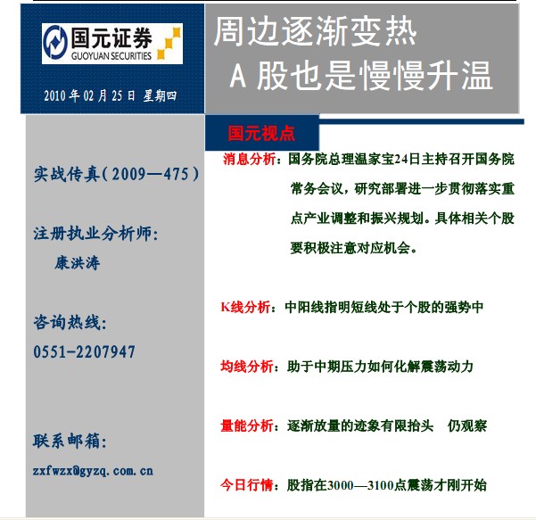 由于国内市场基本面及流动性继续向好,不支持股市持续大幅走低;随着市场做多信心的逐步提升,后市A股保持宽幅震荡的可能性较大。我们对于后市中期谨慎看多。中长期投资者应该保持持股耐心等待的思路。考虑到未来宏观政策总体仍将保持适度宽松,同时目前A股的估值水平较为合理,建议投资者可逢低关注通胀预期下、基本面比较确定、存在高比例送配的中小股票的投资机会。另外,随着经济的持续复苏,受益通胀预期的品种也可适当关注。银行、保险、地产以及有色金属等大类品种的超跌反弹的机会也可适当关注。最后,建议投资者积极关注受益于股指期货以及融资融券等业务的相关大盘蓝筹股的阶段性投资机会.....