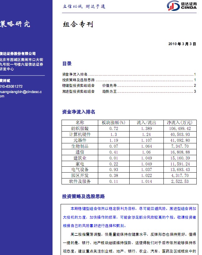 投资策略及选股思路 本期稳健型组合依然以稳定获利为目标,尽可能回避风险。激进型组合将加大投机的力度,加快操作的频率,可能会涉足部分风险较高的个股。敬请投资者根据自己的风险喜好进行选择和甄别。 周二股指震荡调整,但是量能保持在健康水平,反弹形态也保持完好。值得一提的是,银行、地产板块继续维持强势,这使得我们对于后市依然能够保持乐观态度。建议重点关注创业板、地产、银行、农业、汽车、医药及区域板块中的操作机会........