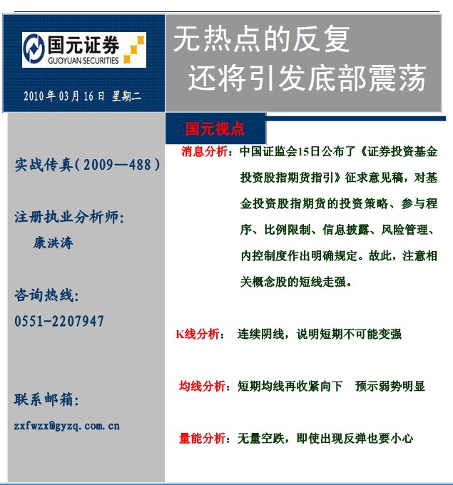 消息分析:中国证监会15日公布了《证券投资基投资股指期货指引》征求意见稿,对金投资股指期货的投资策略、参与序、比例限制、信息披露、风险管理内控制度作出明确规定。故此,注意关概念股的短线走强。 K线分析: 连续阴线,说明短期不可能变强 均线分析:短期均线再收紧向下 预示弱势明显 量能分析:无量空跌,即使出现反弹也要小心 今日行情:再次面临考验2950点有效支撑作用 .......
