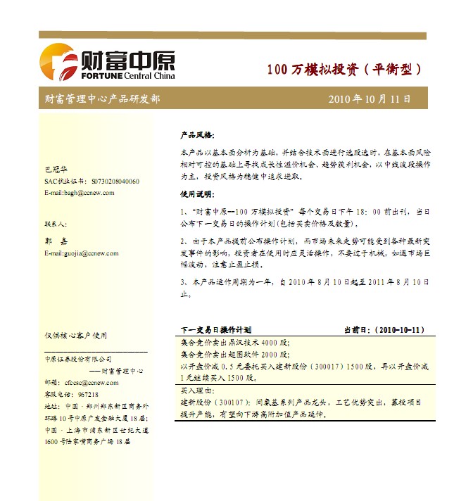 10月12日中原证券100万模拟盘
