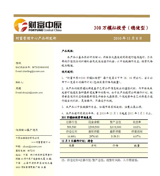 11月9日中原证券300万模拟盘