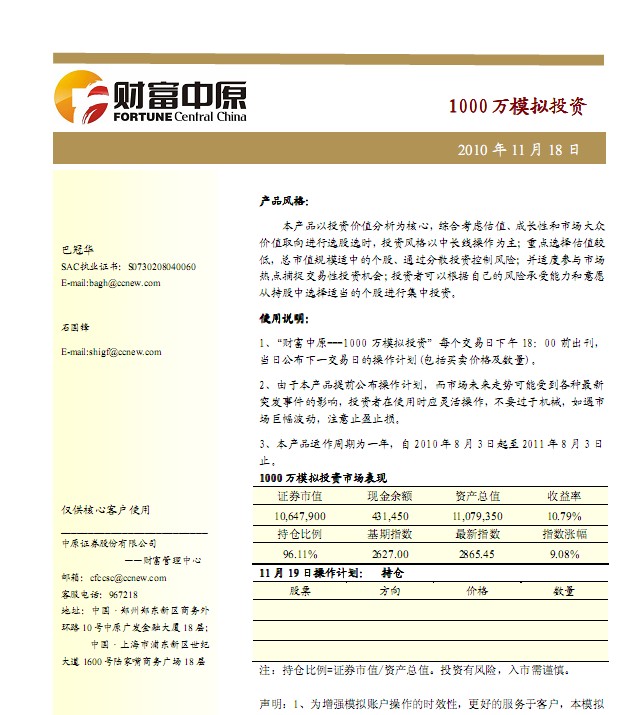 11月19日中原证券1000万模拟盘