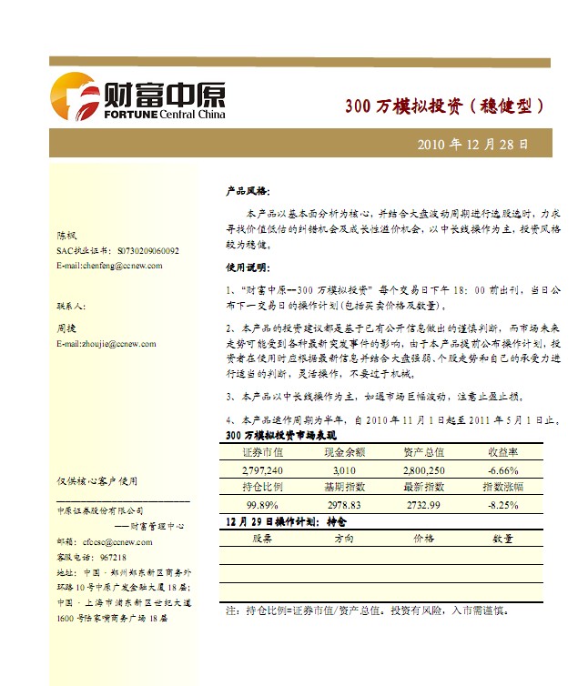 12月29日中原证券300万模拟盘