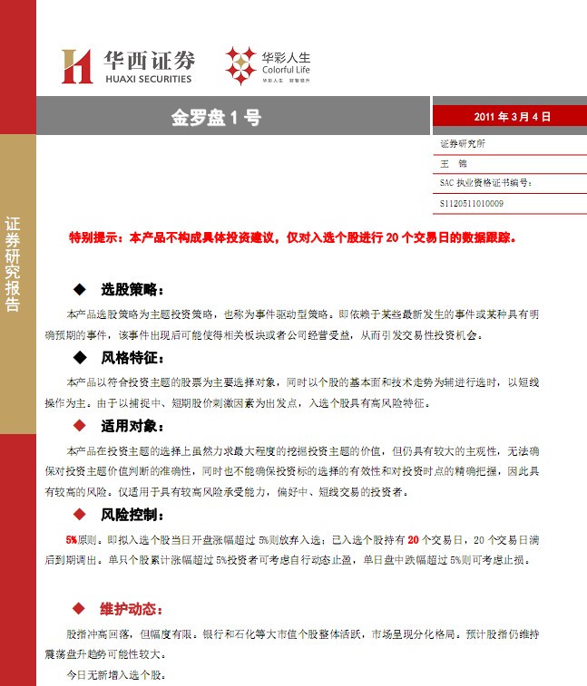 3月4日华西证券金罗盘1号