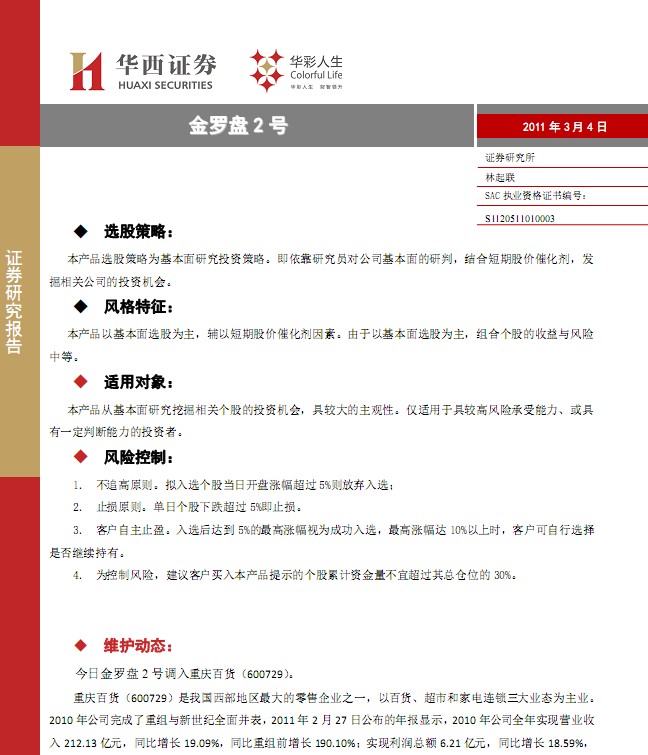 3月4日华西证券金罗盘2号