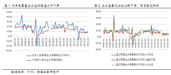 宏观经济正处于缓慢企稳回升阶段是目前市场的普遍观点,我们认为在2013年宏观经济企稳回升后,零售板块有望跟随经济缓慢复苏,复苏的程度和力度还需要看总体经济增速水平,价格指数对复苏的程度存在影响,但影响程度小于总体经济环境的影响。我们预计明年社零增速提升是大概率事件,预计全年社零增速在14.4%左右。基于低基数效应,板块收入增速提高概率大。