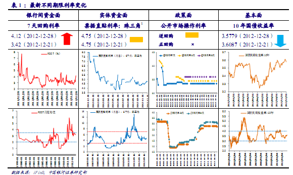 利率走势一览:年底相对平稳度过。银行间市场短期资金价格涨跌互现。14 天、21 天期限回购利率分别上升70、41bp;21 天、1 月期限回购利率分别下跌3、16bp,回购利率曲线整体向上凸出。年底资金面虽然持续紧张,但与过去两年相比处在相对平稳位