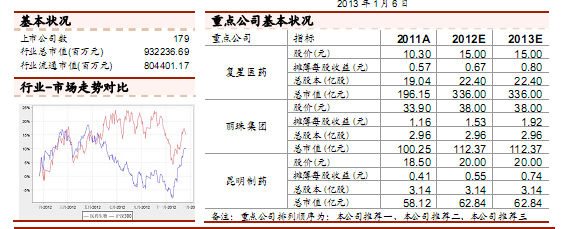 事件:1 月6 日,国务院发布关于印发生物产业发展规划的通知。生物产业是国家确定的战略性新兴产业之一, 2011 年我国生物产业实现总产值约2 万亿元,年均增速22.9%,其中生物医药是重要组成部分。此次生物产业规划明确发展生物产业的指导思想、基本原则和发展目标,并提出重点领域、主要任务以及保障措施。我国生物产业发展的中长期目标包括:到2015 年,我国生物产业形成特色鲜明的产业发展能力,对经济社会发展的贡献作用显著增强,在全球产业竞争格局中占据有利位置。到2020 年,生物产业发展成为国民经济的支柱产业。具体目标包括:结构布局更加合理。