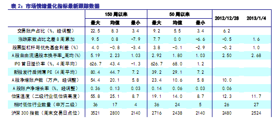 2013 年第一周(2012 年12 月31 日至2013 年1 月4 日)仅两个交易日,大盘延续上周反弹态势,量价继续放大,中小盘走势偏弱。上证综指本周反弹1.96%至2276.99 点,沪深300 指数上涨1.79%,中小板指数下跌0.44%,创业板指数下跌0.33%,年报高送转炒作弱化。从经济面上看,新型城镇化、城市智能化、金融改革等利好政策得以确定,市场对经济增长预期较为乐观,以QFII、RQFII 为代表的海外资金加速流入亦构成了股指反弹的重要推动力量;相对而言,大非延后减持压力的释放,IPO 排队公司持续增加,且市场对新三板扩容预期强化则加大了中小盘股的供给压力,伴随着春节的临近,现金需求大幅上升,资金面或趋紧,这对股市反弹亦是一个考验。