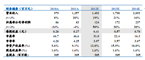 大股东增持凸显对于公司发展的信心。如果按照增持期间的股价来算,大股东的增持均价应当在11.9 元左右。此次增持体现出两大特点: 一是大股东增持股份较多,增持的资金超过3000 万元,增持占比达到总股本的0.85%,且事先没有做增持预告,没有刻意做秀以抬高股价的成分;二是增持均价处于近期相对高位,若按照我们2012 年的预测净利润来看,增持时的PE 应在29 倍左右,体现了对公司的信心。 不排除大股东再次增持。第一大股东增持后占有公司股份为20.21%, 第二大股东湖南涌金投资(控股)有限公司占有12.3%的股份。涌金曾拥有公司17.32%的股份,直逼第一大股东,但在2010 年下半年开始大幅减持。