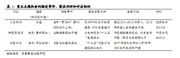 建议关注火电厂脱硝、特高压交流获准建设、水电项目获批带来的主题性投资机会。