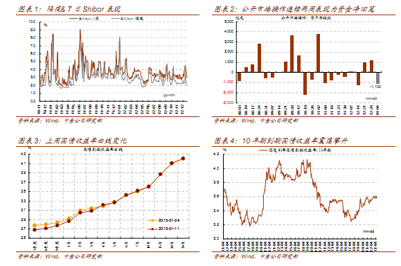 宏观流动性波澜不惊。年关过后储蓄资金的季节性流出使得整体资金面保持在相对宽松状态,为此央行连续两周维持公开市场操作净回笼,共计回笼资金2400 亿元,目前来看7 日shibor 已经从去年年末4.58%的相对高位逐步回降到了2.75%,受逆回购利率以及中下旬企业所得税上缴影响,我们认为资金利率继续下降的空间已经有限。1月份中下旬期间7 日shibor 在3%左右小幅震荡的可能性较大。从历史经验来看,春节前10 天一般是资金需求较大的时间段,因此1 月末至2 月上旬资金利率将呈上行趋势,预计央行也会暨时增加逆回购规模来平滑资金。整体来看我们依然维持此前的观点不变,货币资金利率在年关至春节前呈U 型走势的概率较大。
