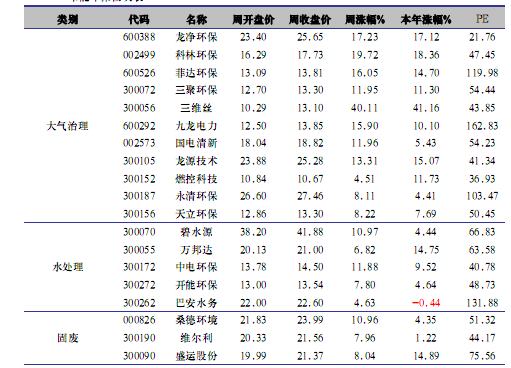 一、市场表现 沪深300 指数收于2595.44 点,单周上涨112.21 点涨幅4.52%。在雾霾天气影响中国北方多个城市的同时,环保板块受到市场的高度青睐,表现极为抢眼,是我们跟踪以来单周的最好表现之一。从细分行业来看,大气治理板块的表现最好,环境监测、水处理等子行业表现也不错, 节能、水务板块相对较弱。个股方面,三维死单周上涨40.16%,涨幅最大。科林环保、龙净环保、菲达环保、九龙电力、龙源技术、先河环保等大气治理相关个股均有10%以上涨幅。前期涨幅巨大的卧龙电气本周回调,下跌0.19%,首航节能下跌2.5%。