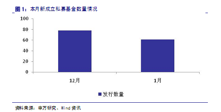 新成立私募基金产品数量:1 月有61 只私募基金产品成立,从数量上看较12 月新成立的78 只基金有所下降。但总体来看,私募发行节奏始终维持在较快水平上,反映伴随市场行情的持续走好,私募产品发行热度没有消退。
