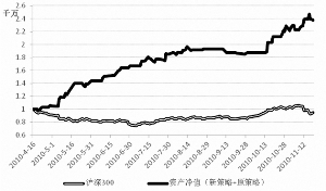 接着,我们根据T日的基差变化量构建了一个新的短期交易策略,并对其自2010年4月16日股指期货上市以来的资产净值走势进行了模拟(见图2),初始资金同样为10,000,000元。从图2可以看出,新交易策略的资产净值在整段期间内呈现出逐步递增的势头,而且具有较高的稳定性。