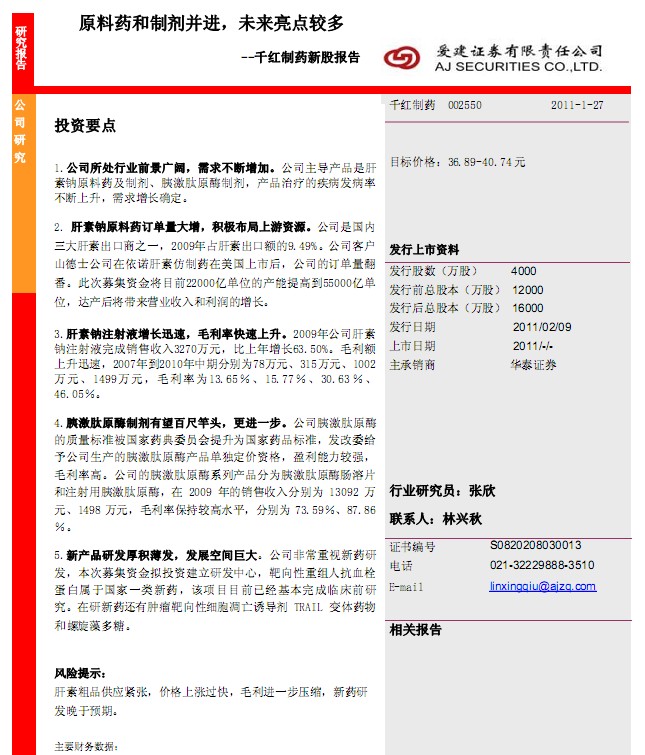 爱建证券研究报告:千红制药(002550)原料药和制剂并进,未来亮点较多:研 1.公司所处行业前景广阔,需求不断增加。公司主导产品是肝素钠原料药及制剂、胰激肽原酶制剂,产品治疗的疾病发病率不断上升,需求增长确定。 2. 肝素钠原料药订单量大增,积极布局上游资源。公司是国内三大肝素出口商之一,2009年占肝素出口额的9.49%。公司客户山德士公司在依诺肝素仿制药在美国上市后,公司的订单量翻番。此次募集资金将目前22000亿单位的产能提高到55000亿单位,达产后将带来营业收入和利润的增长。 3.肝素钠注射液增长迅速,毛利率快速上升。2009年公司肝素钠注射液完成销售收入3270万元,比上年增长63.50%。毛利额上升迅速,2007年到2010年中期分别为78万元、315万元、1002 万元、1499万元,毛利率为13.65%、15.77%、30.63%、 46.05%。 4.胰激肽原酶制剂有望百尺竿头,更进一步。公司胰激肽原酶的质量标准被国家药典委员会提升为国家药品标准,发改委给予公司生产的胰激肽原酶产品单独定价资格,盈利能力较强,毛利率高。公司的胰激肽原酶系列产品分为胰激肽原酶肠溶片和注射用胰激肽原酶,在 2009 年的销售收入分别为 13092 万元、1498 万元,毛利率保持较高水平,分别为 73.59%、87.86 %。 5.新产品研发厚积薄发,发展空间巨大。公司非常重视新药研发,本次募集资金拟投资建立研发中心,靶向性重组人抗血栓蛋白属于国家一类新药,该项目目前已经基本完成临床前研究。在研新药还有肿瘤靶向性细胞凋亡诱导剂 TRAIL 变体药物和螺旋藻多糖。 风险提示: 肝素粗品供应紧张,价格上涨过快,毛利进一步压缩,新药研发晚于预期.......