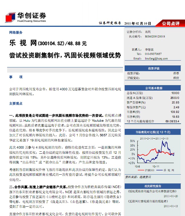 华创证券研究报告:乐视网(300104)尝试投资剧集制作,巩固长视频领域优势:公司于周四晚间发布公告,拟使用 4000 万元超募资金对外联合投资四部电视剧获取网络版权。 主要观点 一、此项投资是公司试图进一步巩固长视频市场优势的一次尝试。在视频点播领域,以Hulu 为代表的长视频网站在业绩上要远远好于 Youtube 为代表的短视频网站,虽然后者流量远远高于前者。公司在国内长视频领域取得领先优势但是在优酷、酷 6等竞争对手的竞争下,长视频版权成本提高很快。因此公司加大了对长视频内容版权的投入,此前,公司 1月份公告投入 5657万元购买华谊兄弟旗下 19部电视剧的网络独家版权。 此次4000万参与 4部电视剧的制作,获得的收益有三方面:一是剧集的网络版权的优先购买权;二是协议约定的保障性收益,按照协议投资发生后 12 月获得固定回报 15%,另外如最终购买网络版权,则固定回报为 13%。三是获得剧集“出品单位”或“联合出品”的署名权,产生品牌宣传效益。 考虑到当前剧集版权价格飞涨的市场现状和此次协议的保障性约定,我们认为此次投资是视频领域新商业模式的一次有益的尝试,将提升公司长视频领域行业地位。 二、 合作共赢, 拓宽上游产业链客户关系。 投资合作方为新经典娱乐传媒(NCE 旗下的东阳狂欢者影视文化有限公司。NCE是国内影视制作领域的新起之秀之前参与投资了张艺谋的《山楂树之恋》和刘若英、陈亦迅主演的《隐婚男女等电影,电视剧方面投资了《我是太阳》、《血色迷雾》、《你是我兄弟》等剧,受到了市场一定的认可。 直接合作方东阳狂欢者影视文化公司,负责的是电视剧制作发行。公司联合其投资的四部剧集中包括柳云龙自导自演的《传奇之王》、滕华弢、李晨联合执导的《北京爱情故事》,均为NCE2011年的重要剧目。此外两部《喋血孤军和《悬崖》尚在筹拍中。 本项合作双方优势互补,起到合作共赢的效果。借此合作,公司也拓展了包括华谊兄弟、小马奔腾在内的上游合作关系........