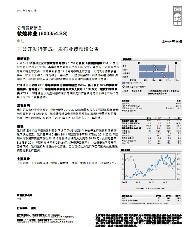 高华证券研究报告:敦煌种业(600354)非公开发行完成;发布业绩预增公:最新事件 2月 15日敦煌种业宣布完成非公开发行 1,758万新股(总股数增加 9%),发行价格为人民币 25元/股,募集资金总额为人民币 4.09亿元。其中 500万新股在 3 年内不得上市交易,而其余新股在 12个月内不得上市交易。公司表示募集资金将用于扩大玉米种子、棉花种子、番茄加工、脱水蔬菜加工和收购新疆玛纳斯油脂资产。我们此前假设以上项目的资本开支将来自内部渠道和银行贷款。 敦煌种业还公布 2010年净利润同比增幅将超过 150%,高于我们 97%的同比增幅预测,意味着 2010年预期净利润将至少为人民币 7,500万元(较我们的预测高 27%)。敦煌种业认为盈利强劲增长的原因是其广受欢迎的玉米种子产品“先锋玉米 335”销售强劲。 潜在影响 我们的玉米种子业务预测中已经假设 2010-2012年销量和收入的预期年均复合增长率分别为 48%和64%,但业绩预增公告显示敦煌种业的玉米种子需求和价格仍高于我们的预测。公司将于 2011年4月 15日发布 2010年业绩。 估值 我们将 2011/12年每股盈利预测下调了 7%/5%以计入非公开发行股票和债务假设下调的因素。我们基于 6.0倍的 2011年预期市净率和 17%的 2011-2012年预期平均净资产回报率得出的 12个月目标价格仍为人民币 36.70元(此前是基于 8.2倍的2011年预期市净率和23%的平均净资产回报率),估值倍数下降表明回报下降。我们维持对该股的中性评级,因为我们认为我们研究范围内的化肥股拥有更多上行空间。 主要风险 上行风险:玉米和棉花种子价格及需求强于预期;主要下行风险:恶劣的天气...........