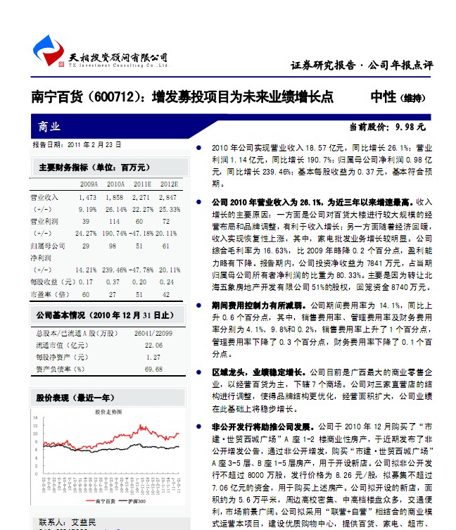 天相投顾研究报告:南宁百货(600712)10年报点评:增发募投项目为未来业绩增长点:2010 年公司实现营业收入18.57 亿元,同比增长 26.1%;营业利润 1.14亿元,同比增长190.7%;归属母公司净利润0.98 亿元,同比增长 239.46%;基本每股收益为0.37元,基本符合预期。 公司2010 年营业收入为 26.1%,为近三年以来增速最高。收入增长的主要原因:一方面是公司对百货大楼进行较大规模的经营布局和品牌调整,有利于收入增长;另一方面随着经济回暖,收入实现恢复性上涨,其中,家电批发业务增长较明显。公司综合毛利率为 16.63%,比 2009 年略降 0.2 个百分点,盈利能力略有下降。报告期内,公司投资净收益为7841 万元,占当期归属母公司所有者净利润的比重为80.33%。主要是因为转让北海五象房地产开发有限公司51%的股权,回笼资金8740 万元。 期间费用控制力有所减弱。公司期间费用率为 14.1%,同比上升 0.6 个百分点,其中,销售费用率、管理费用率及财务费用率分别为4.1%、9.8%和0.2%,销售费用率上升了1个百分点,管理费用率下降了0.3个百分点,财务费用率下降了0.1 个百分点。 区域龙头,业绩稳定增长。公司目前是广西最大的商业零售企业,以经营百货为主,下辖 7个商场。公司对三家直营店的结构进行调整,使得品牌结构更优化,经营面积扩大,公司业绩在此基础上将稳步增长。 非公开发行将助推公司发展。公司于2010年 12 月购买了“市建·世贸西城广场”A 座1-2 楼商业性房产,于近期发布了非公开增发公告,通过非公开增发,购买“市建·世贸西城广场” A 座3-5 层、B座1-5层房产,用于开设新店。公司拟非公开发行不超过 8000 万股,发行价格为 8.26 元/股,拟募集不超过 7.06亿元的资金,用于购买上述房产。公司拟开设的新店,面积约为 5.6 万平米,周边高校密集、中高档楼盘众多,交通便利,市场前景广阔。公司拟采用“联营+自营”相结合的商业模式运营本项目,建设优质购物中心,提供百货、家电、超市、餐饮娱乐等一站式消费全方位服务。 非公开发行若在2011 年得以完成,预计新店将在2013 年初渡过盈亏平衡期。短期来看,公司盈利水平存在下降风险。预计新店开业首年营业收入可达 3.5 亿元,此后3-5年每年以20%速度递增,预计渡过盈亏平衡期后,可每年增厚EPS为0.05元.......