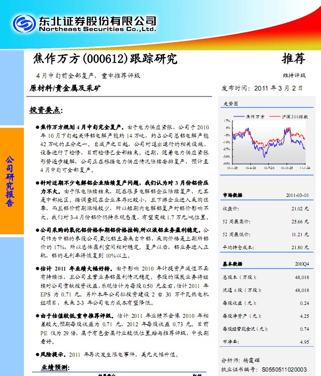 东北证券研究报告:焦作万方(000612)跟踪研究4月中旬前全部复产:焦作万方规划 4月中旬完全复产。由于电力供应紧张,公司于 2010 年 10 月下旬起关停铝电解产能约 14 万吨,约占公司总铝电解产能 42万吨的三分之一。自减产之日起,公司对退出运行的相关设施、设备进行了检修,目前检修已全部结束。近期,随着电力供应紧张形势逐步缓解,公司正在根据电力供应情况陆续安排复产,预计至 4月中旬可全部复产。 针对近期不少电解铝企业陆续复产问题,我们认为对 3 月份铝价压力不大。由于限电陆续结束,现在很多电解铝企业陆续复产,尤其是中部地区。据调查现在企业库存比较小,且下游企业进入采购旺季,而且铝价前期涨幅较少,所以短期内电解铝复产对铝价影响不大。我们对 3-4 月份铝价仍持乐观态度,有望突破 1.7万元/吨位置。 公司采购的氧化铝价格和期铝价格挂钩,所以液铝业务盈利稳定。公司作为中铝的参股公司,氧化铝主要来自中铝,采购价格是上期所铝价的 17%,所以总体盈利空间相对稳定。复产以后,铝业务进入正轨,铝的毛利率将恢复到 10%以上。 估计 2011 年业绩大幅好转。由于影响 2010 年计提资产减值不具有持续性,且公司主营业务铝盈利情况稳定。参股的煤炭业务将继续对公司贡献投资收益, 乐观估计为每股0.50 元左右, 估计2011 年 EPS 为 0.71 元。另外本年公司拟投资建设 2 台 30 万千瓦热电机组项目,未来 2-3 年公司电力成本有望降低。 由于估值较低,重申推荐评级。估计 2011 年业绩不会像 2010 年相差较大,预期每股收益为 0.71 元,2012 年每股收益 0.73 元。目前 PE 仅为 29倍,属于有色金属行业较低位置,给与推荐评级,中长期看好。 风险提示。2011 年再次发生限电事件,美元大幅升值.......