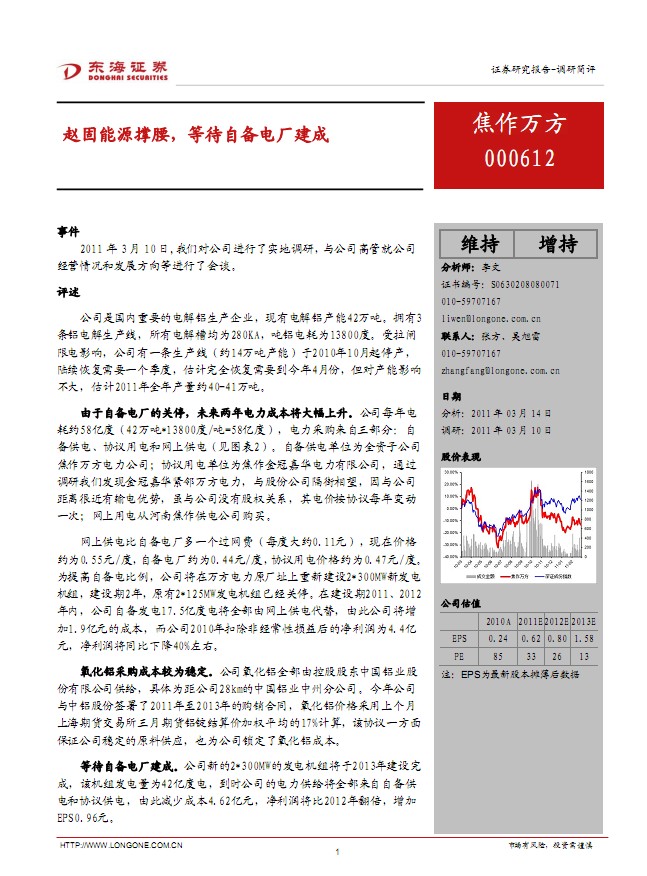 东海证券研究报告:焦作万方(000612)赵固能源撑腰 等待自备电厂建成:事件 2011年3月10日,我们对公司进行了实地调研,与公司高管就公司经营情况和发展方向等进行了会谈。 评述 公司是国内重要的电解铝生产企业,现有电解铝产能42万吨。拥有3 条铝电解生产线,所有电解槽均为280KA,吨铝电耗为13800度。受拉闸限电影响,公司有一条生产线(约14万吨产能)于2010年10月起停产,陆续恢复需要一个季度,估计完全恢复需要到今年4月份,但对产能影响不大,估计2011年全年产量约40-41万吨。 由于自备电厂的关停,未来两年电力成本将大幅上升。公司每年电耗约58亿度(42万吨*13800度/吨=58亿度),电力采购来自三部分:自备供电、协议用电和网上供电(见图表2)。自备供电单位为全资子公司焦作万方电力公司;协议用电单位为焦作金冠嘉华电力有限公司,通过调研我们发现金冠嘉华紧邻万方电力,与股份公司隔街相望,因与公司距离很近有输电优势,虽与公司没有股权关系,其电价按协议每年变动一次;网上用电从河南焦作供电公司购买。 网上供电比自备电厂多一个过网费(每度大约0.11元),现在价格约为0.55元/度,自备电厂约为0.44元/度, 协议用电价格约为0.47元/度。为提高自备电比例,公司将在万方电力原厂址上重新建设2*300MW新发电机组,建设期2年,原有2*125MW发电机组已经关停。在建设期2011、2012 年内,公司自备发电17.5亿度电将全部由网上供电代替,由此公司将增加1.9亿元的成本,而公司2010年扣除非经常性损益后的净利润为4.4亿元,净利润将同比下降40%左右。 氧化铝采购成本较为稳定。公司氧化铝全部由控股股东中国铝业股份有限公司供给,具体为距公司28km的中国铝业中州分公司。今年公司与中铝股份签署了2011年至2013年的购销合同,氧化铝价格采用上个月上海期货交易所三月期货铝锭结算价加权平均的17%计算,该协议一方面保证公司稳定的原料供应,也为公司锁定了氧化铝成本。 等待自备电厂建成。公司新的2*300MW的发电机组将于2013年建设完成,该机组发电量为42亿度电,到时公司的电力供给将全部来自自备供电和协议供电,由此减少成本4.62亿元,净利润将比2012年翻倍,增加 EPS0.96元........