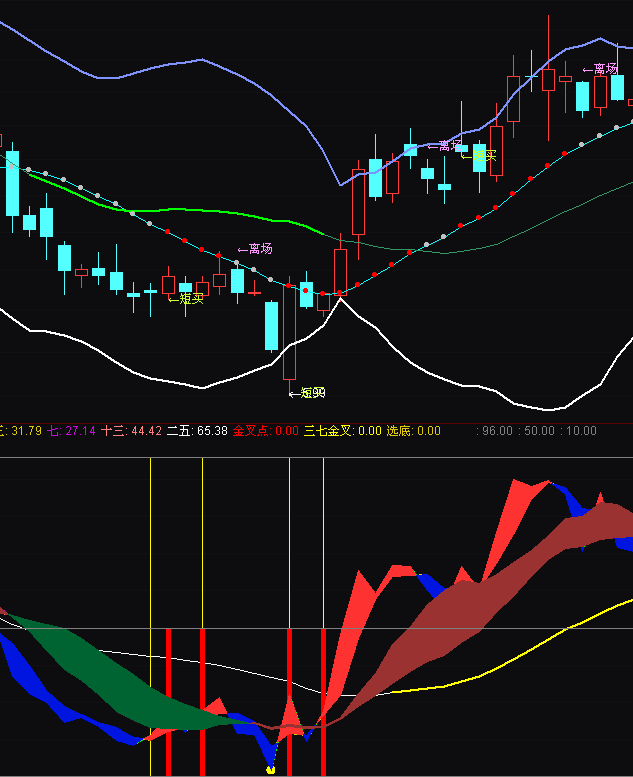 STICKLINE(金叉点>0 AND 获利比<50,10,96,0,0),COLORYELLOW;