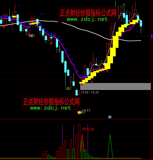 顶天立地:IF(CROSS(趋势,人气) AND (趋势<30),50,0),COLOR0000FF,LINETHICK2;