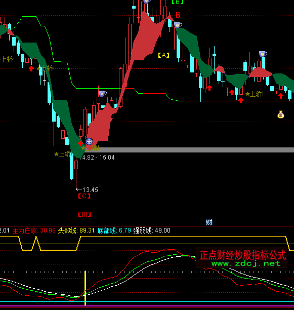 底部雷达:IF(CROSS(VAR4,10) AND VAR4>10,50,0),STICK,COLORYELLOW,LINETHICK3;0,STICK,COLOR000000,LINETHICK3;