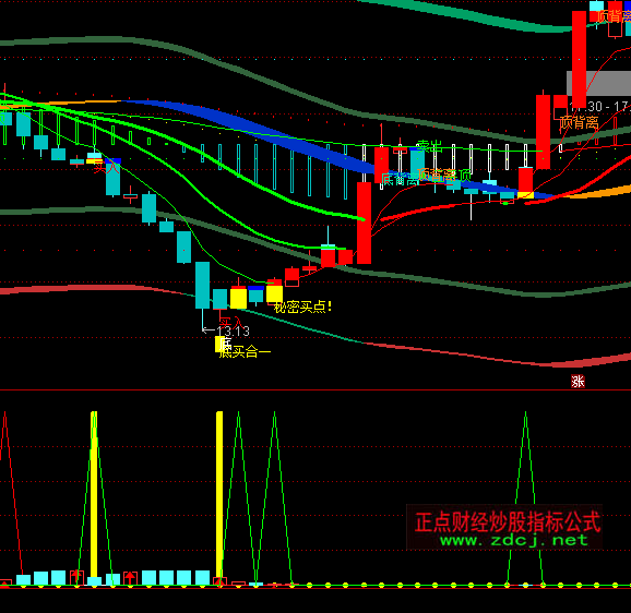 底部区域:EMA(IF(L<=LLV(L,15),EMA(C,20),0),3)/200,VOLSTICK;