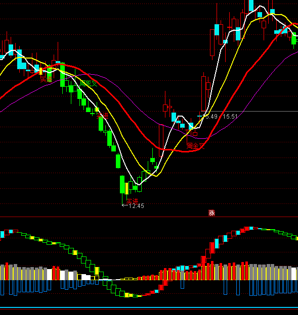 ZJ1:=DMA((H+L+C*2)/4,0.9); ZJ2:=V/((H-L)*2-ABS(C-O));
