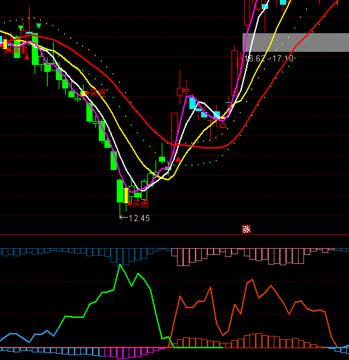 DIF负:IF("MACD.DIF"(12,26,9)<0,兰柱线,DRAWNULL),COLORGREEN,LINETHICK2;