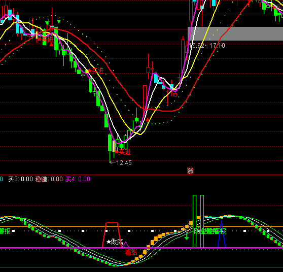 买12:IF(CROSS(神奇线,0) AND LOW/REF(HIGH,1)<1.012 AND ((C-REF(C,2))/C)>0.06,100,0),COLORMAGENTA,LINETHICK2;