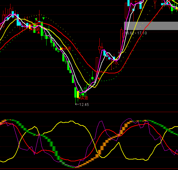DRAWTEXT(ISLASTBAR=1 AND (CROSS(【强弱】,Y2) OR VAR2E>45),80,' 短期吃货!'),COLORRED;