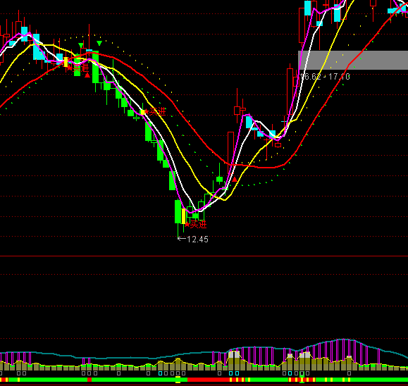 DRAWTEXT(CONST(价格WR=-100)AND CURRBARSCOUNT=50,ZGD2*1.25,'●量价很弱不碰!'),COLORFF00FF ;