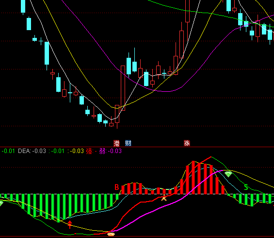 弱:IF(DEA>MA(DEA,2),DEA,DRAWNULL),COLORMAGENTA,LINETHICK2;