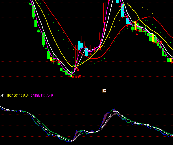 DRAWBAND(均价,RGB(0,130,50),收均线,RGB(100,30,80));