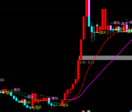 DRAWTEXT(VAR1A,REF(CLOSE,1)+0.1,'←离场'),COLORFF99FF;