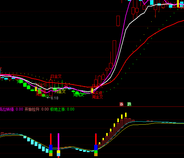 低位转强:IF(CROSS(A5,安全位),50,0),STICK,COLORMAGENTA,LINETHICK2;