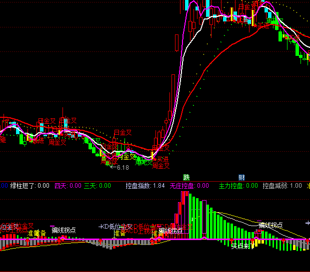 主力控盘: 控盘指数>REF(控盘指数,1) AND 控盘指数>0,LINETHICK0,COLORRED;