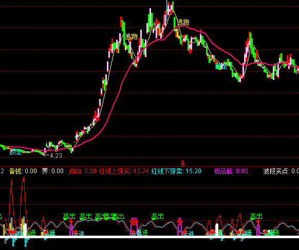 红线下穿卖:EMA(红线上穿买,3),COLORFFFF00;