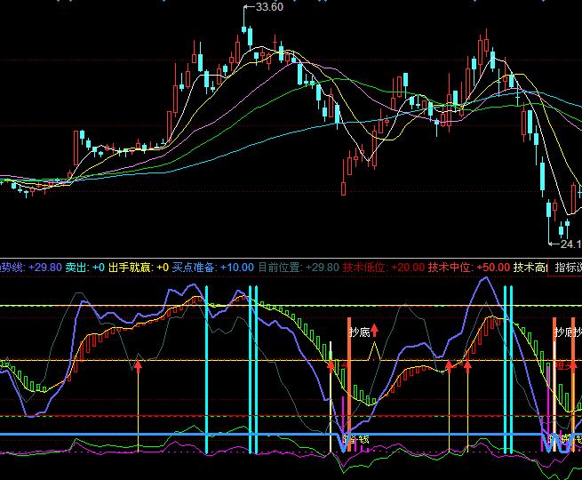 卖出:IF((CROSS(波段鬼,波段王) OR CROSS(波段鬼,趋势线) OR CROSS(波段王,趋势线) ) AND 波段鬼>65,90,0),STICK,colorffff00 ,linethick3;
