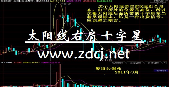 - 大阳线右肩十字星(分类:K线)大阳线右肩十字星第一根K线为中阳线或大阳线,第二根K线为长十字星,大阳线右肩十字星位于大阳线的右肩上,十......