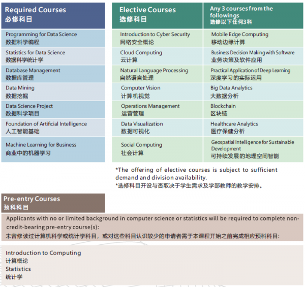 学生需要修读7门必修科目和3门选修科目。未曾修读过计算机科学和统计学科目或对这些科目认识较少的申请者,可在开学前完成相应的预科科目(计算概论和统计学)。